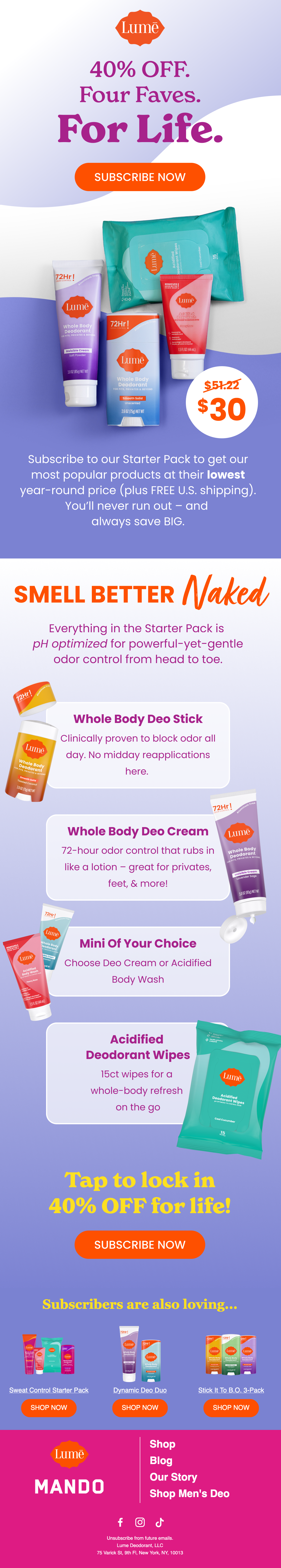 As Senior Graphic Designer at Lume Deodorant, an offbeat, fast-growing personal care brand that’s redefining hygiene, I created eye-catching digital and email marketing designs that brought the brand’s playful personality to life. Working with the in-house creative team, I designed and built Klaviyo emails, performance marketing assets, and social media graphics while keeping everything on-brand and fresh. It was a fast-paced, fun role where I stayed adaptable, thought on my feet, and made every project feel a little bit cheeky—just like Lume.