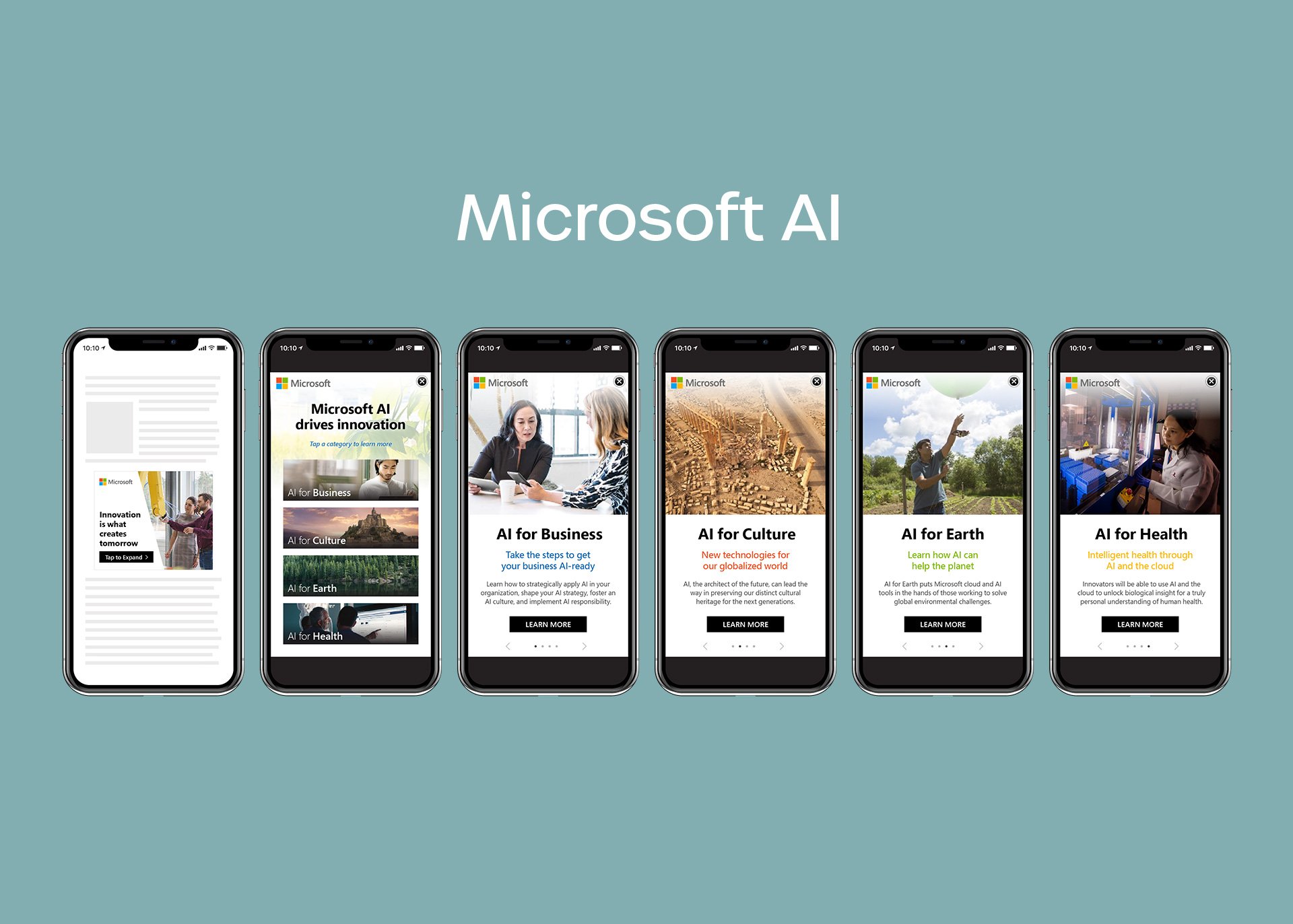 Microsoft AI — Clicking on the banner ad to the left opens a full-screen, interactable ad which lets customers learn about the endless possibilities of Microsoft AI technology.